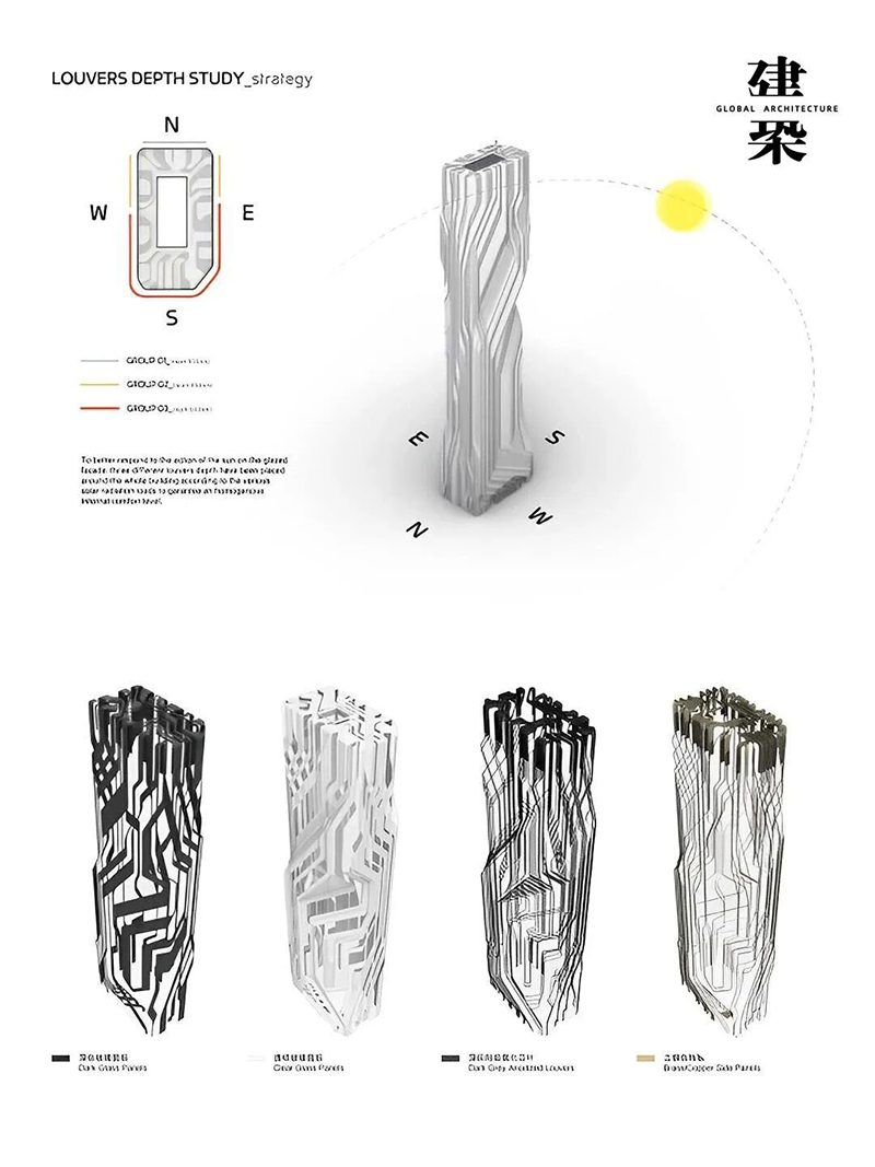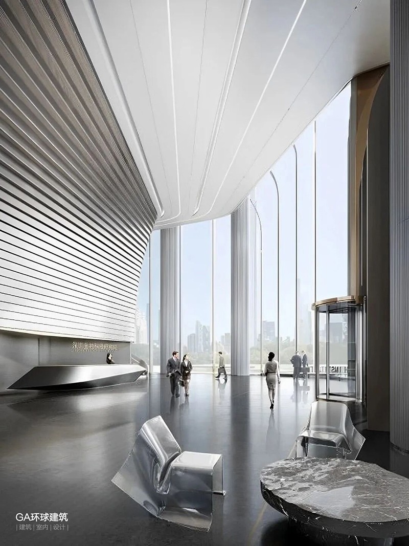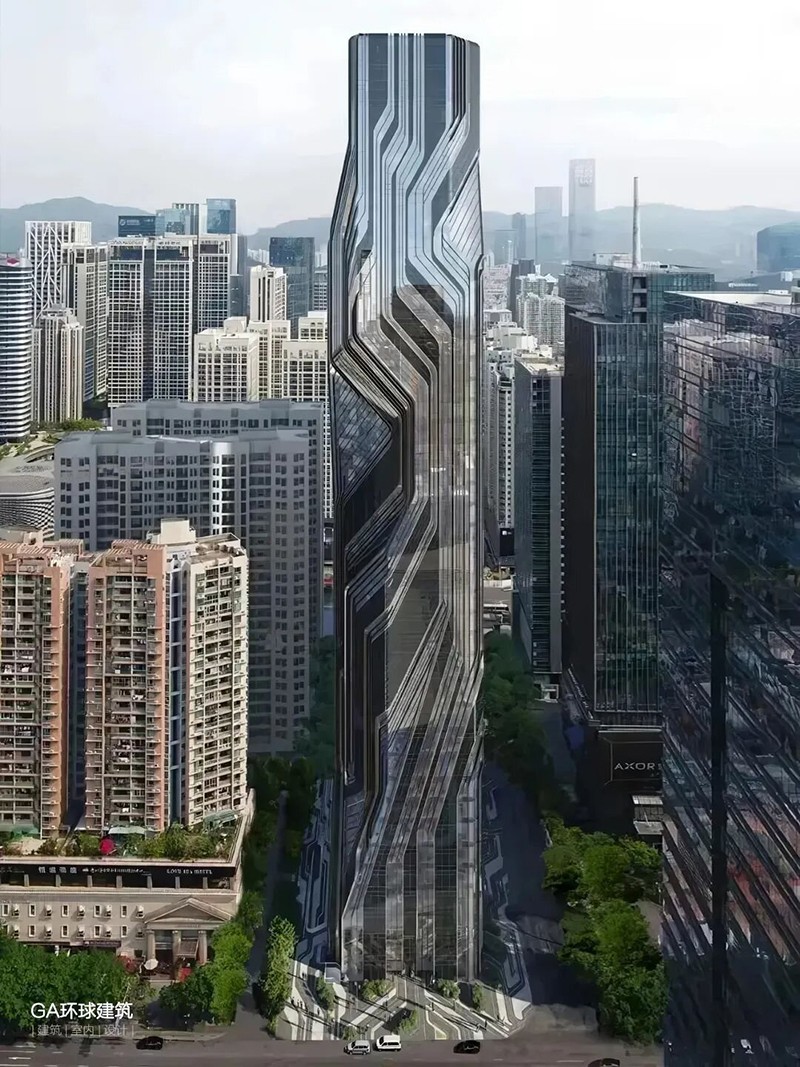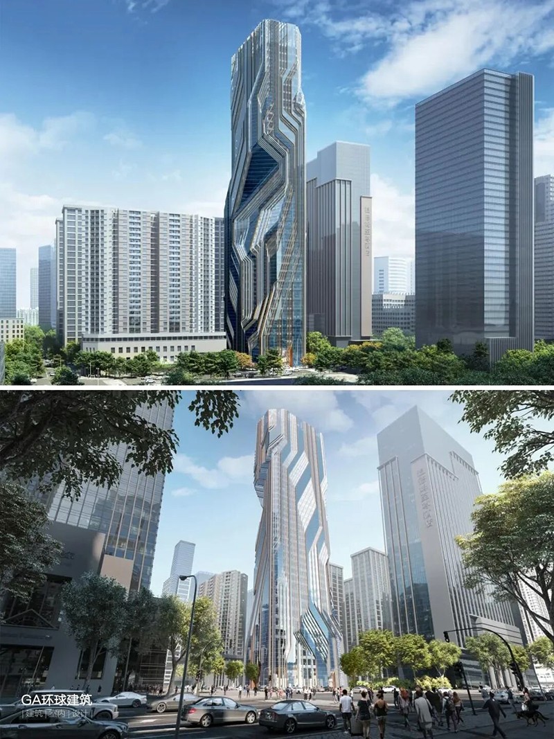 該建筑概念設計由扎哈·哈迪德事務(wù)所實(shí)施,將塔樓“切割”形成這一不規則形體,以減少對周邊建筑造成日照影響。外立面則通過(guò)深灰色低反射玻璃和高透中反射玻璃的交錯組合,旨在表達“數字貨幣”“日新月異”發(fā)展變化的項目定位。