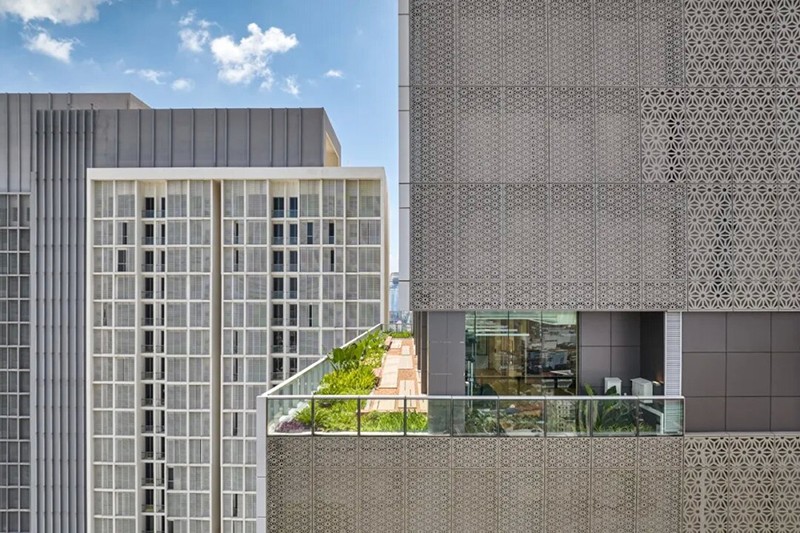 考慮到金邊的氣候以及日照情況,在東西立面特別采用了帶有紋理的復合板,降低建筑得熱。覆層上的蓮花圖案,為立面增添了一絲優(yōu)雅與柔和。玻璃幕墻主要位于南北立面,將自然光引入室內空間。