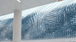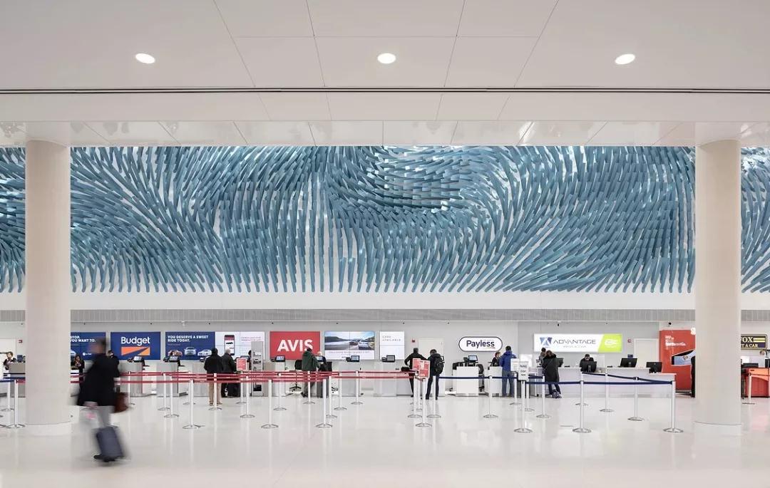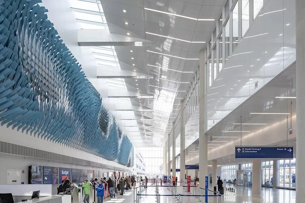 這件大型作品位于新擴建的奧黑爾機場(chǎng)轉機中心,全部由成型的鋁制元件構成,好似微風(fēng)吹過(guò)田野形成的「藍色海洋」。