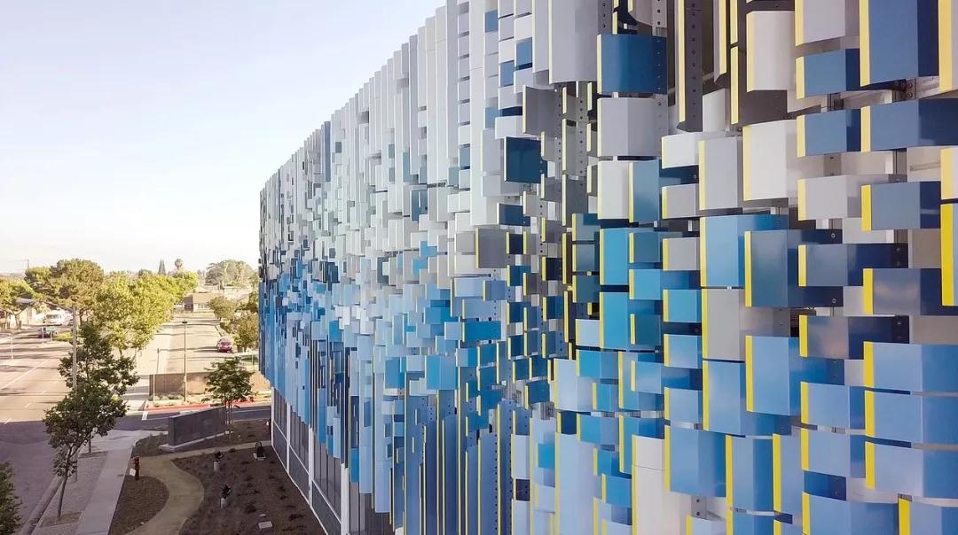 這件作品由數千個(gè)涂漆的彎曲金屬板組成,在遠處看好似一幅馬賽克圖,而靠近了看就能看到一個(gè)個(gè)不同顏色的色塊跳躍在外墻上。
