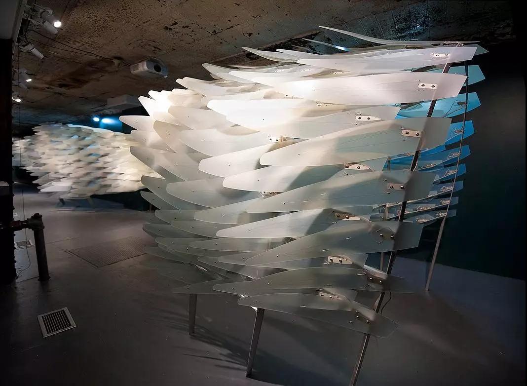 這個(gè)裝置創(chuàng )造了一個(gè)復雜而靈活的社交空間,卷曲的半透明面板通過(guò)精心組合形成羽翼般的造型。