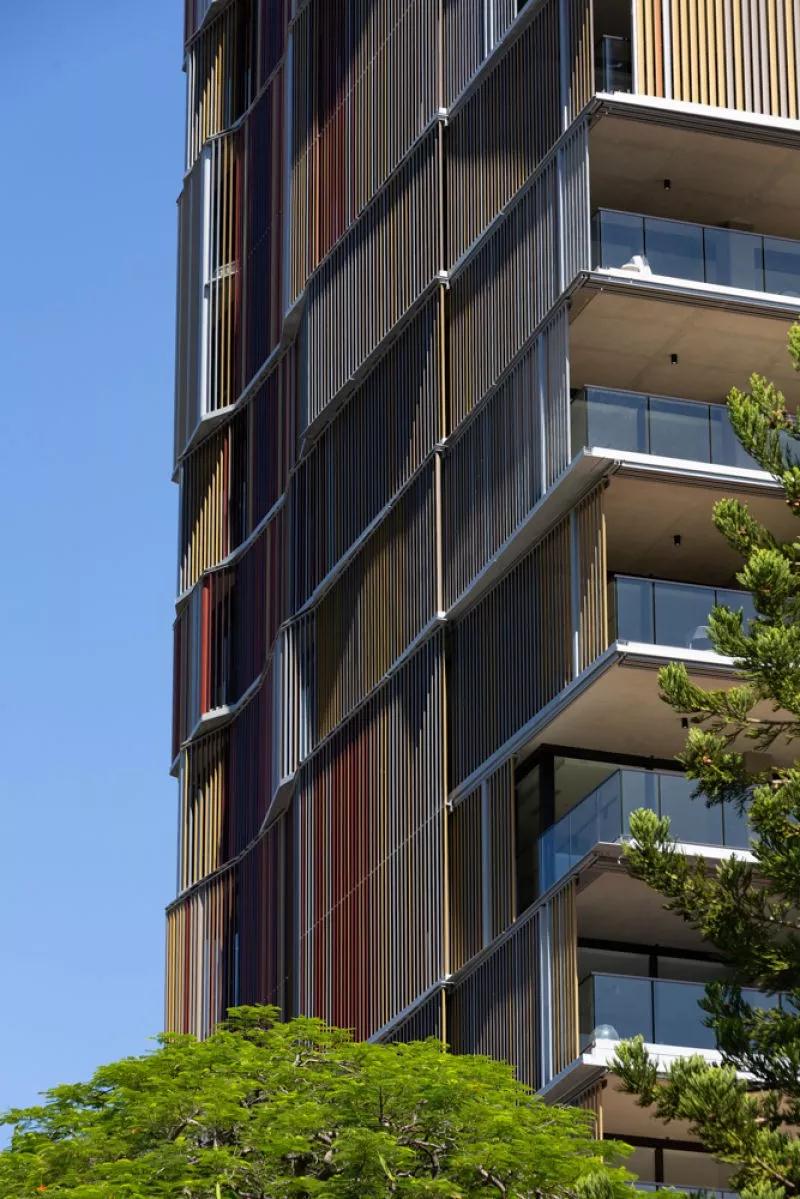 外墻的金屬板條從附近的景觀(guān)中采取顏色,混合了塵埃紅,棕色和黃色,在塔樓的立面上形成了漸變的圖案,臥室和衛生間的部分被很好的遮擋起來(lái)。