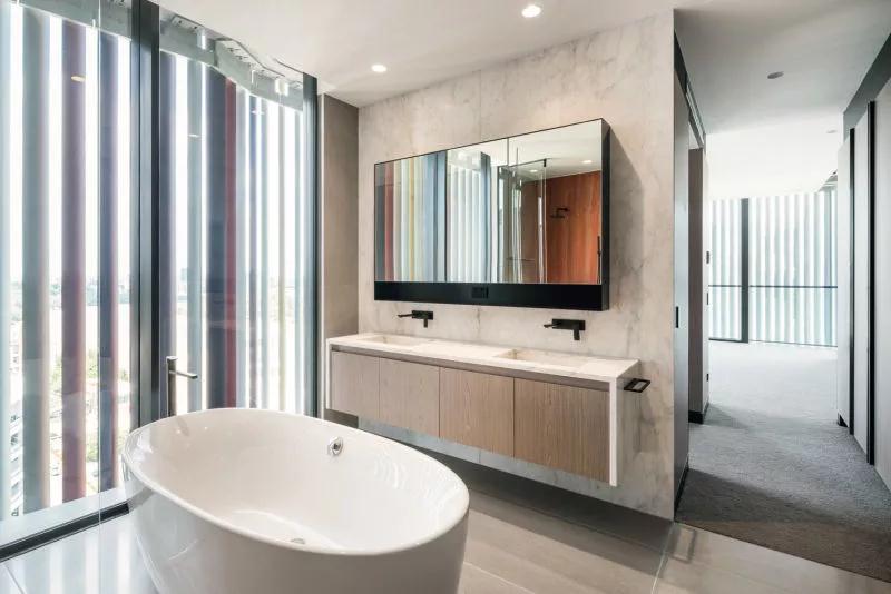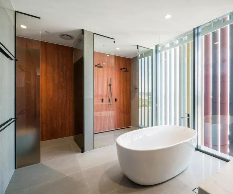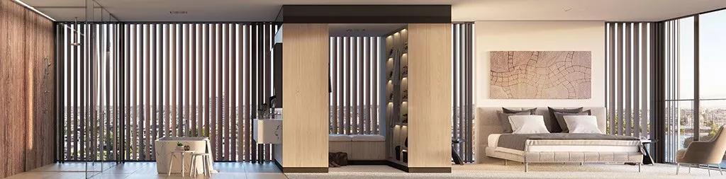 整個(gè)主人套房擁有超過(guò)44平方米,步入式衣帽間和帶獨立式浴缸,雙花灑淋浴頭的淋浴房,形成一個(gè)頂級的主臥套間。