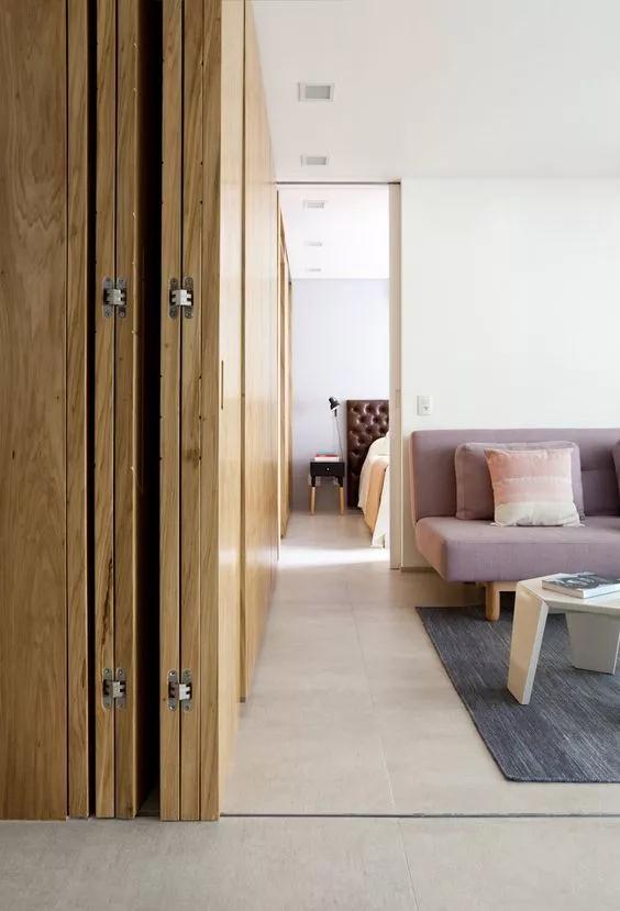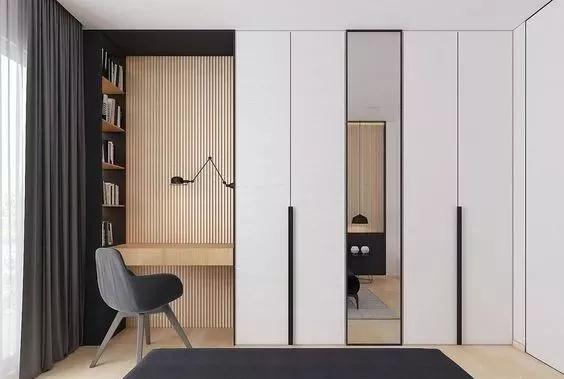帶有衣帽柜、儲物柜等具有儲藏功能的空間,是最適合做隱形門(mén)的地方。尤其注意的是門(mén)要和柜子齊平,這樣可以更好的達到“隱身”的效果。
