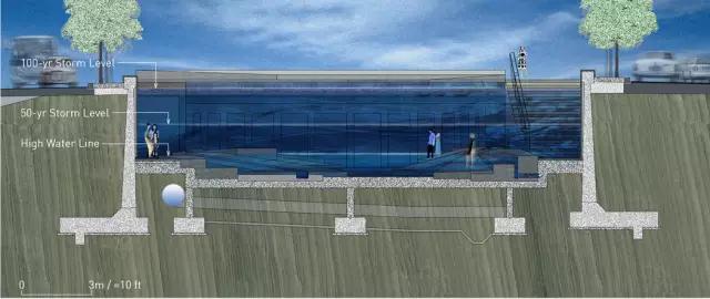 (3)人工自然式護岸:用石材、鋼筋混凝土等材料還原堤岸形態(tài),以實(shí)地情況為依據,將緩坡式、臺階式及后退式堤岸結合起來(lái)。如果沒(méi)有建筑低臺地,可以根據淹沒(méi)的周期性設計更多的親水性空間。