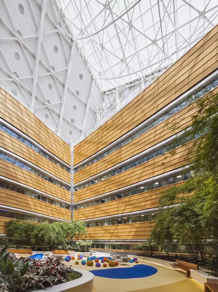 每個(gè)醫院的住院室都被三個(gè)用于康復的花園中庭環(huán)繞。玻璃封閉的電梯廳可俯瞰大廳中庭和康復花園中庭,引導訪(fǎng)客和患者進(jìn)入大樓。