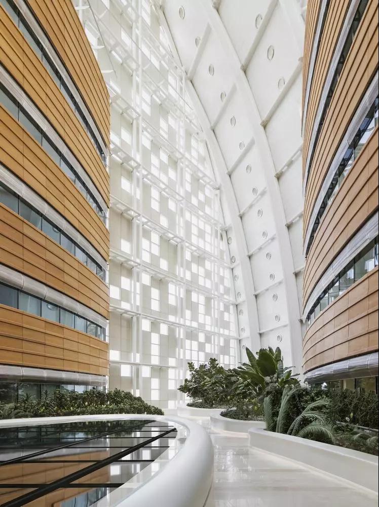 每個(gè)專(zhuān)科醫院的特征都由一個(gè)巨大的、帆狀的中庭形成,在街道和地下停車(chē)場(chǎng)都有專(zhuān)門(mén)的落客區和入口區。