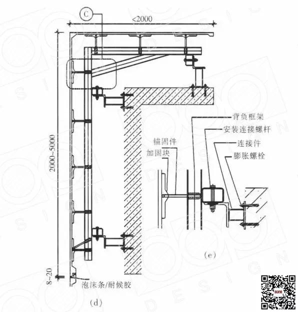 幕墻材料通過(guò)干掛的方式,安裝固定。通過(guò)膨脹螺栓將幕墻材料及骨架與建筑進(jìn)行連接,通過(guò)幕墻干掛件控制幕墻懸挑的長(cháng)度。