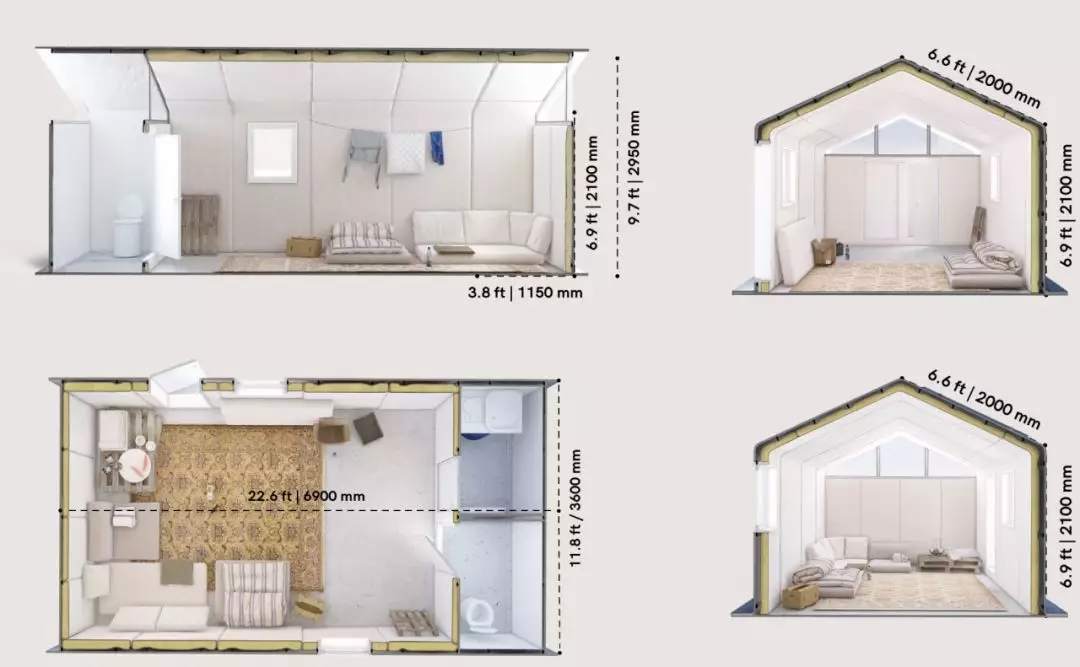 一個(gè)房子的長(cháng)為6.9米,寬3.6米,高2.95米,同時(shí),內部空間還可靈活分割。