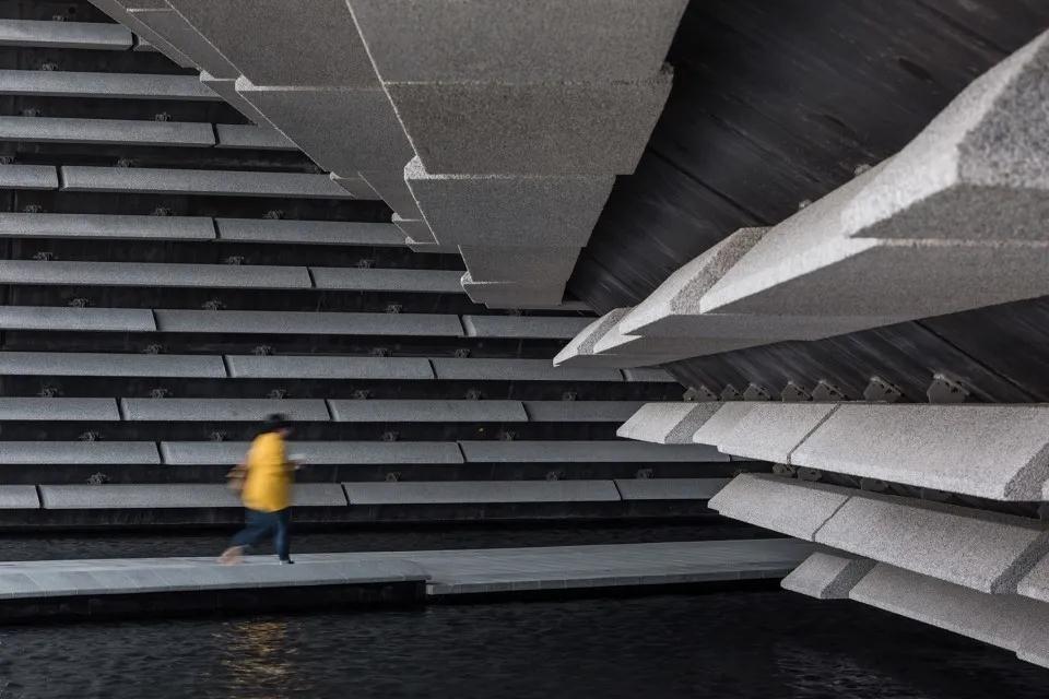 場(chǎng)地面對一條河流,建筑提出了一種新的綜合方式來(lái)實(shí)現與環(huán)境的和諧。外表皮的材質(zhì)是預制混凝土,建筑的外輪廓沿著(zhù)起伏的混凝土墻延伸,由此生出奇妙的視覺(jué)光影效果,并且形成的光影會(huì )隨著(zhù)天氣和時(shí)間而變化。