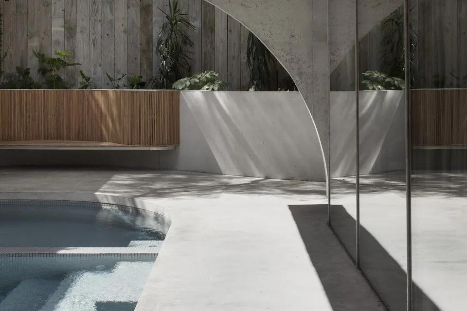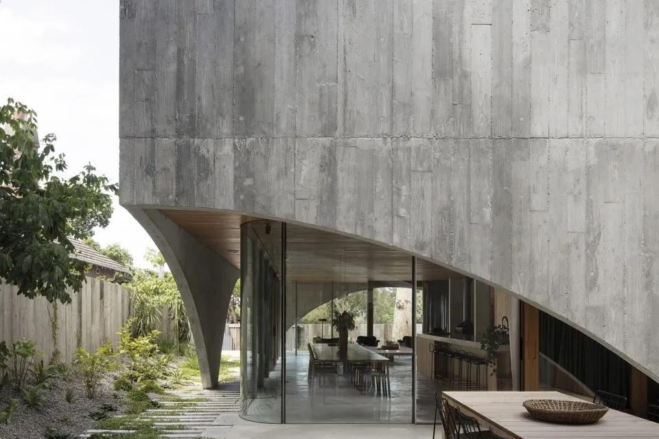 Hawthorn住宅由兩個(gè)體量組成,每個(gè)體量之上都罩有一個(gè)比例、特點(diǎn)各不相同的質(zhì)地粗糙的混凝土外殼,通過(guò)一個(gè)走廊和庭院花園聯(lián)系在一起。混凝土外殼下部為拱形,演變?yōu)橐粋€(gè)支撐結構,通過(guò)自身的結構來(lái)承擔自身的荷載;這樣的設計手法使得混凝土外殼在兼具結構作用的同時(shí),充當著(zhù)住宅的外表皮。
