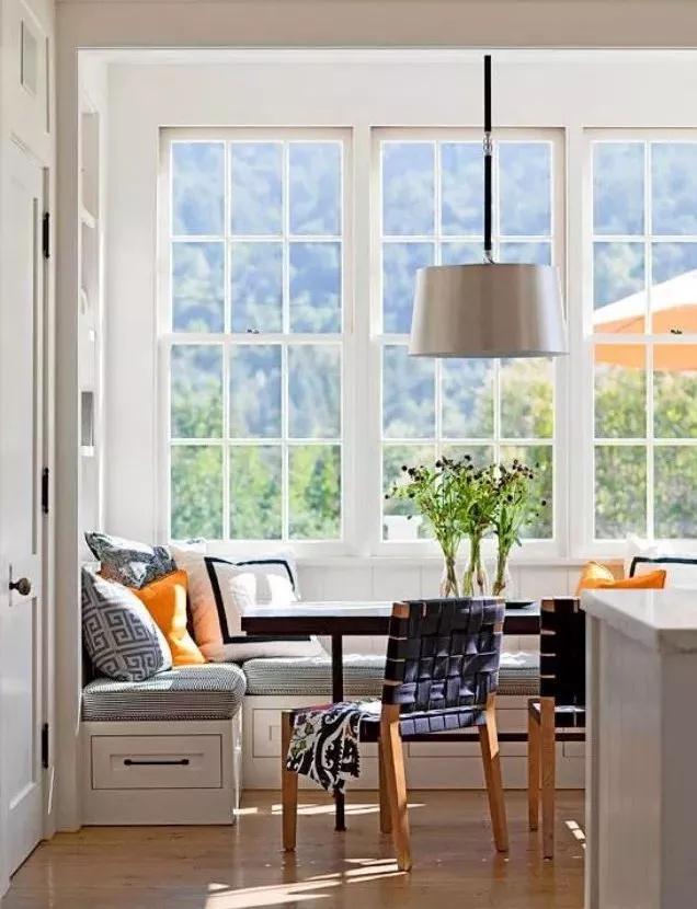 極具情調的雅座,不僅在高雅的西餐廳可以享受到,家里也可以實(shí)現。在靠近窗戶(hù)的位置,不妨挪出2㎡左右的面積,搭建出舒適、休閑的飄窗卡座,營(yíng)造一種優(yōu)雅氣息。