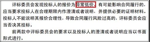 發(fā)現投標人的報價(jià)為異常低價(jià),有可能影響合同履行的,應當要求投標人在合理期限內作澄清或者說(shuō)明,并提供必要的證明材料。不能說(shuō)明其報價(jià)合理性,導致合同履行風(fēng)險過(guò)高的,應當否決其投標。
