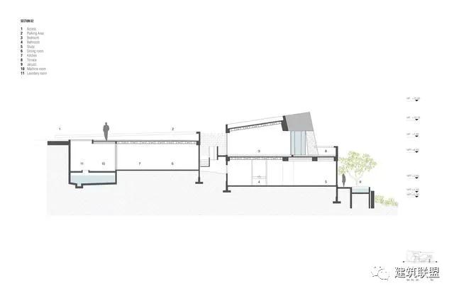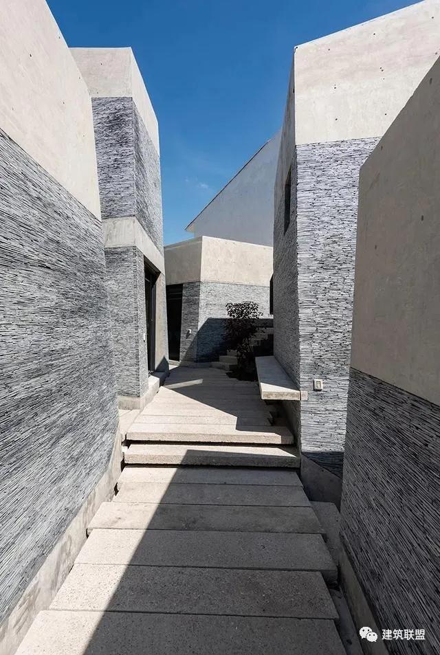 總部位于墨西哥城的Rojkind建筑事務(wù)所設計完成的Amanali住宅在視覺(jué)上使人想起環(huán)境中的自然條件。與“Tepeji Del Rio”的名字巨石相呼應,這座住宅的五個(gè)棱柱體量被源于當地的暗色的、具有透氣性的石材所覆蓋。這些體量進(jìn)行了單獨規劃,劃分出客廳、廚房-餐廳區和臥室。流線(xiàn)被完全轉移到室外,組合的體塊之間通過(guò)蜿蜒的戶(hù)外走道連接起來(lái)。毗鄰的長(cháng)方形場(chǎng)地向下方傾斜,俯瞰著(zhù)附近的高爾夫球場(chǎng),并能望見(jiàn)水池和遠處的山脈。當走進(jìn)房子時(shí),游客從街道平面下來(lái),穿過(guò)一條展示了這座山丘小鎮的中世紀氛圍的私密小巷,住宅漸漸露了出來(lái)。