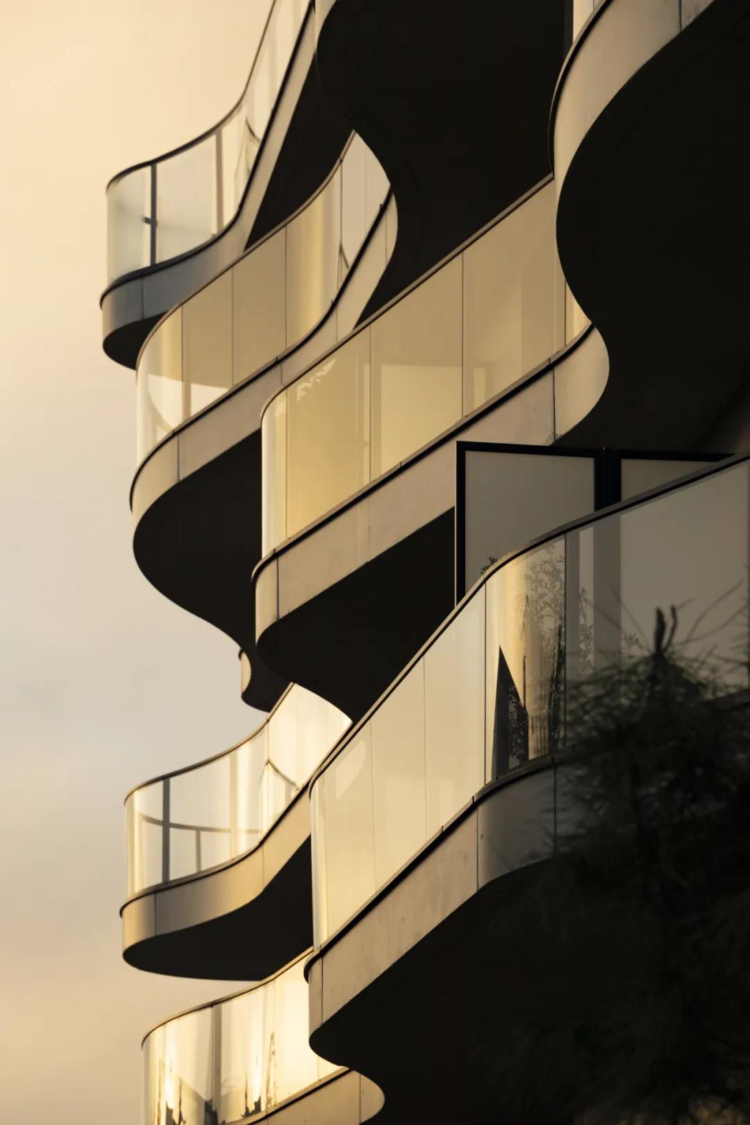 每個(gè)樓層均根據其特定位置進(jìn)行設計,同時(shí)遵循方向,相鄰結構以及上下兩層的體量。陽(yáng)臺的設計(反射和透明之間)減輕了建筑的巨大體量感,提供了戶(hù)外露天空間。該項目中共使用了超2公里的曲面玻璃。
