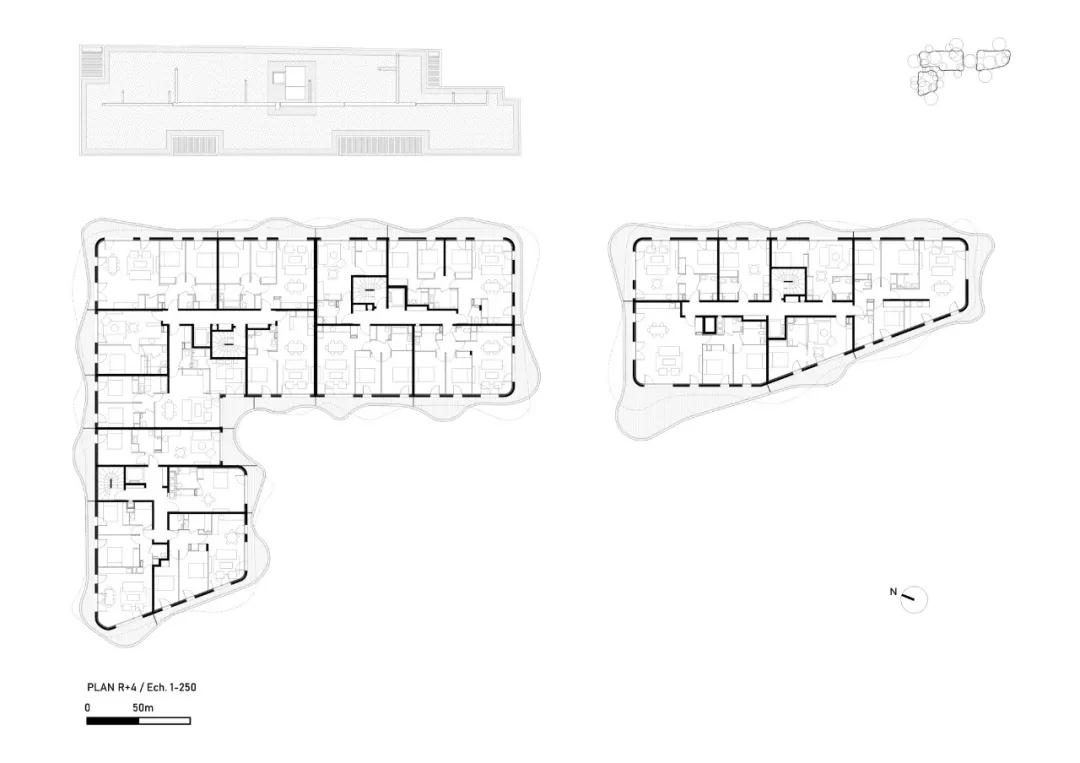 該項目擁有134套公寓,是城鎮入口的標志,其形態(tài)則使每套公寓都具有獨特的特征。目的是使該區域致密,同時(shí)尊重所有人的舒適感。
