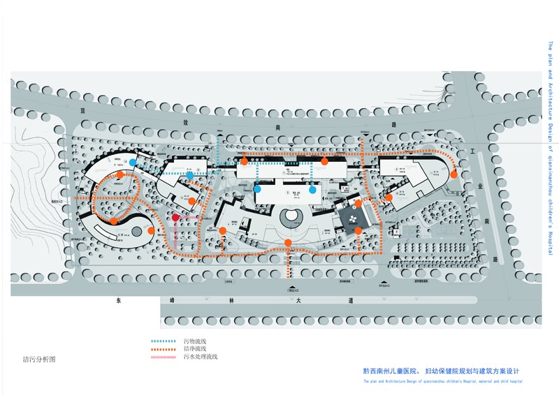 門(mén)診流線(xiàn)主要通過(guò)南側人行廣場(chǎng)進(jìn)入醫療主街,發(fā)熱門(mén)診及兒童急診主要人東側人行廣場(chǎng)單獨進(jìn)入,婦產(chǎn)急診則通過(guò)西側人行廣場(chǎng)單獨進(jìn)入:住院流線(xiàn)通過(guò)北側進(jìn)入住院部大廳,或者經(jīng)由門(mén)診部二樓亦可直接通達:供應流線(xiàn)婦幼醫院住院部一層南側進(jìn)入;污物流線(xiàn)則由地下一層將污物收集整理完畢后直接出地面通過(guò)污物出口離開(kāi)場(chǎng)地;辦公流線(xiàn)由醫技部豎直交通直達醫技樓三層四層辦公區。