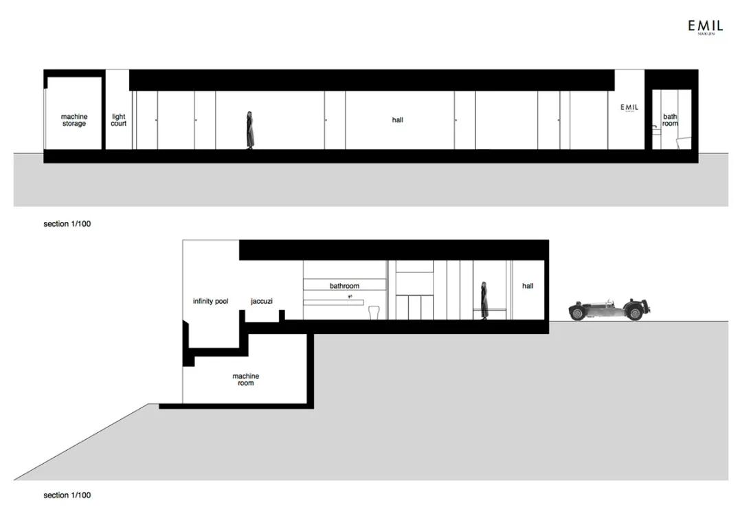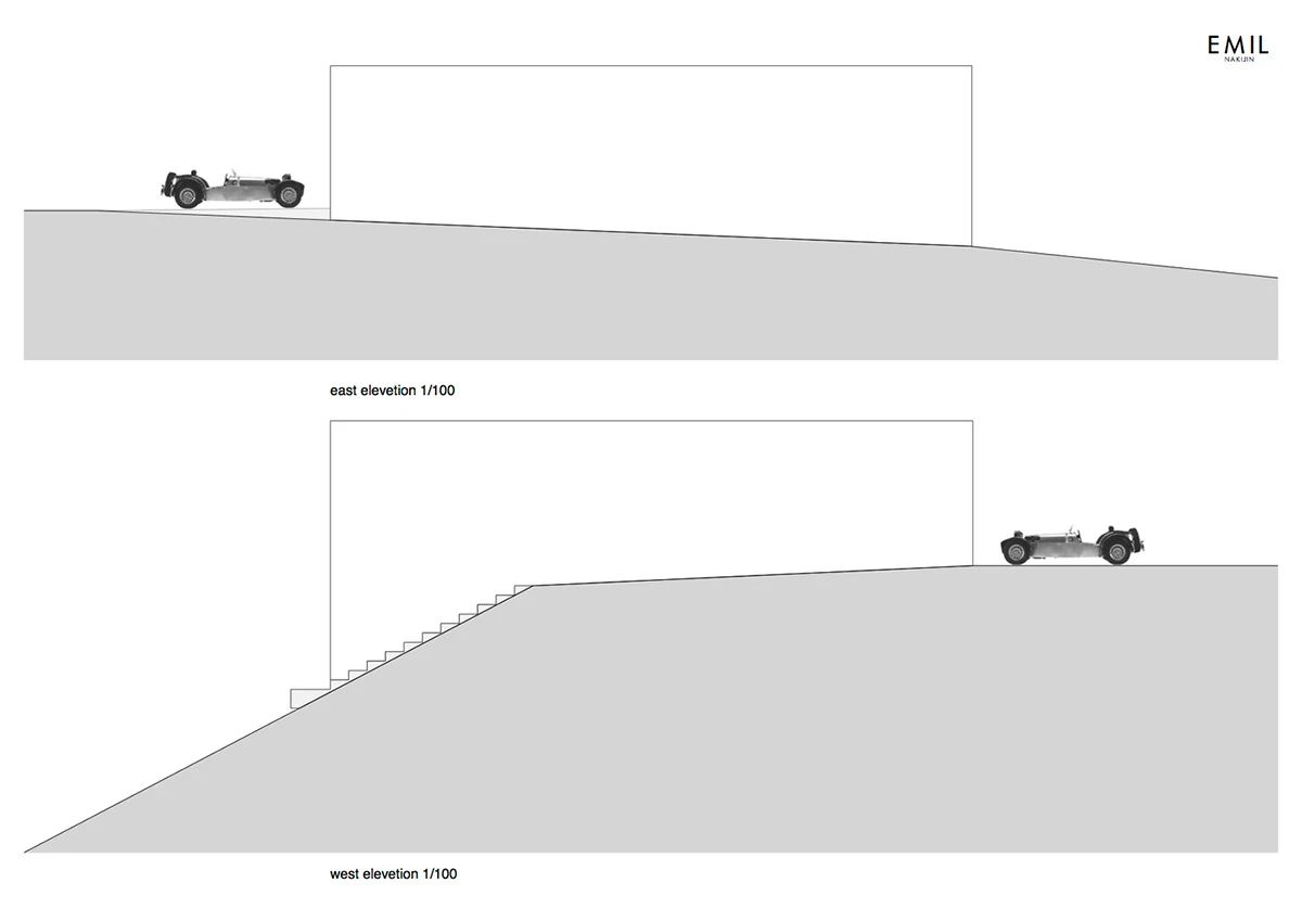 該建筑位于街道上朝北的懸崖頂上,沒(méi)有任何窗戶(hù)和開(kāi)口,僅包含一個(gè)將顧客帶到細長(cháng)大廳的入口。