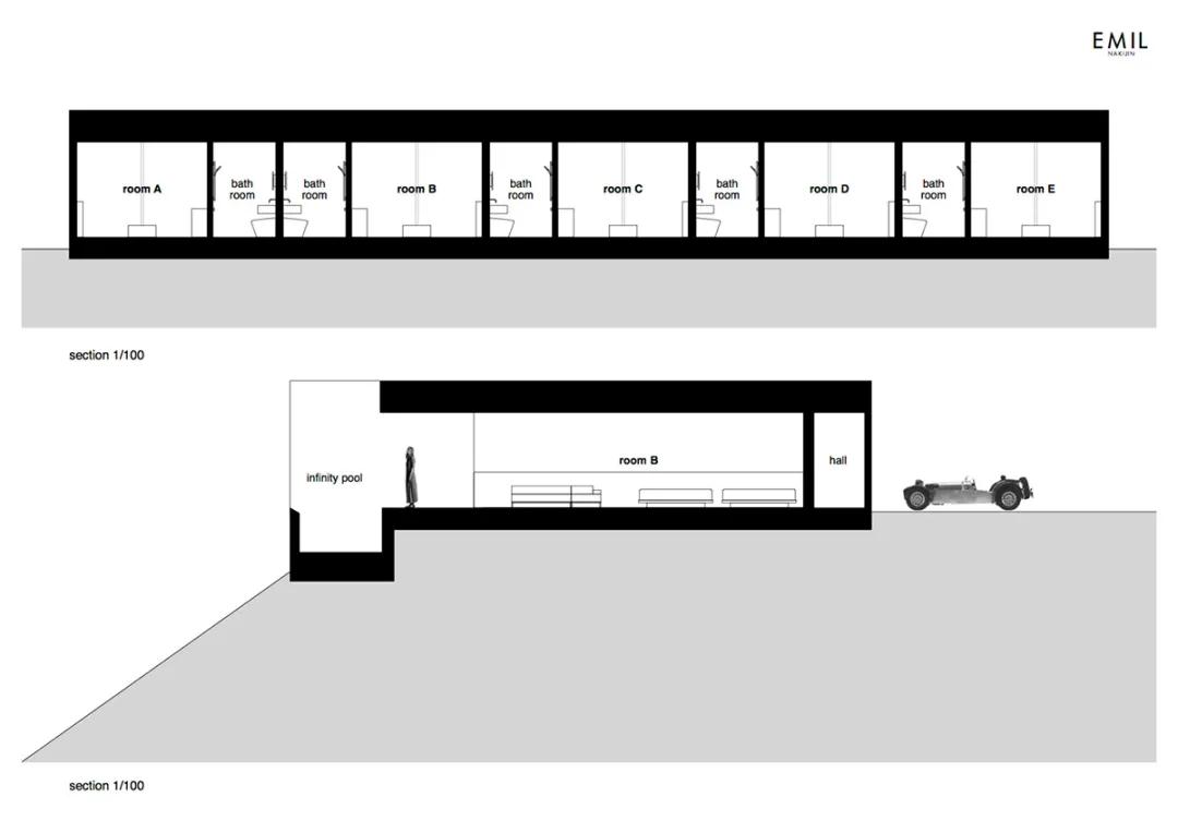 “按照拉長(cháng)的平面布置,每間客房的內部都包括床位,起居室和淋浴間。每間客房的外部都包括露天浴池,露臺和無(wú)邊泳池?!?/p>