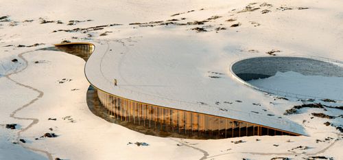 該建筑現在猶如雕刻在俯瞰伊卡盧伊特的巖石山坡上,遵循著(zhù)廣闊地形的曲線(xiàn)和縱向特征。建筑與巖石景觀(guān)融為一體,可以在這里一覽無(wú)余地欣賞苔原。