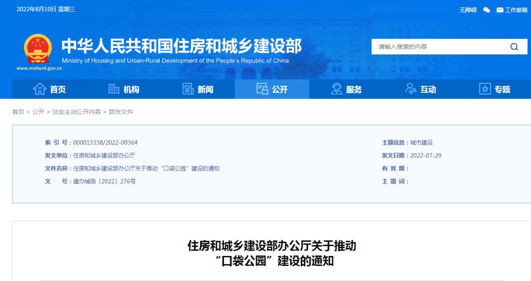 8月9日,住房和城鄉建設部辦公廳下發(fā)《關(guān)于推動(dòng)“口袋公園”建設的通知》,決定,推進(jìn)2022年全國建設不少于1000個(gè)城市“口袋公園”