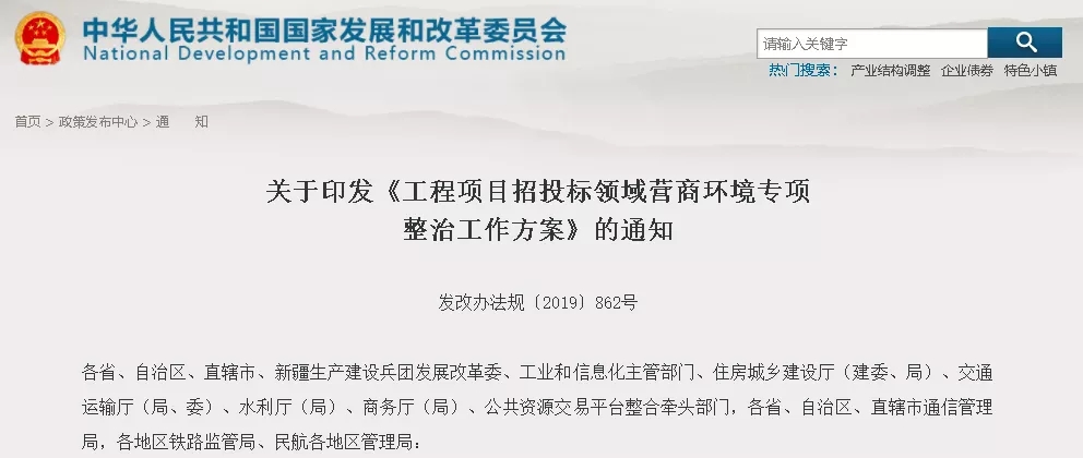 國家發(fā)改委、住建部、工信部、交通部、水利部等八部門(mén)聯(lián)合下發(fā)通知,決定在全國開(kāi)展工程項目招投標領(lǐng)域營(yíng)商環(huán)境專(zhuān)項整治。本次專(zhuān)項整治自8月20日起開(kāi)展,12月15日之前結束。